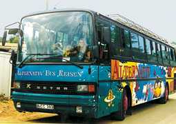 Unser Hundertwasser-Reisebus mit gemütlicher Lederlounge kann auch als Nightliner mit Betten ausgerüstet werden. Er hat einen großen, hohen Kofferraum, in dem viele Musikinstrumente oder anderes Gepäck Platz finden.